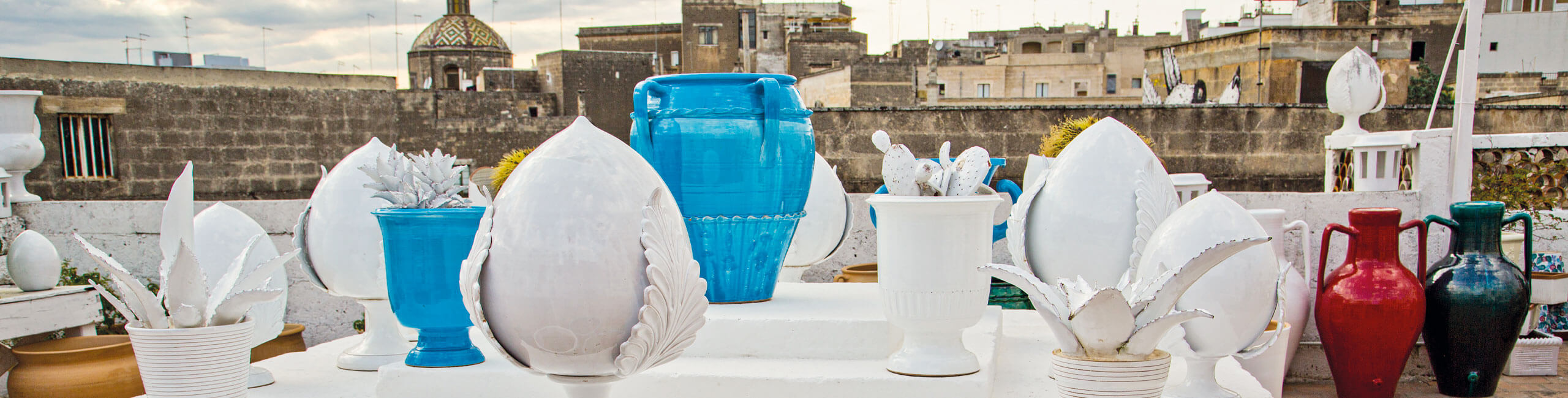 Ceramics have been made in Puglia since the time of the ancient Messapians. The region's signature style features cream colours and simple blue patterns. Many items are also emblazoned with a cockerel, a traditional symbol of fertility. Puglia's ceramics capital is Grottaglie. Here you can pick up crockery and ceramic homeware in the 50 or so workshops that dot its Ceramics District. Other renowned ceramics towns include Cutrofiano, San Pietro in Lama, Martina Franca, Canosa, Lucera, Lucugnano, and Laterza, known for its exquisite majolica pottery. Nearby, Gravina in Puglia specialises in rooster-shaped whistles, once used by shepherds.