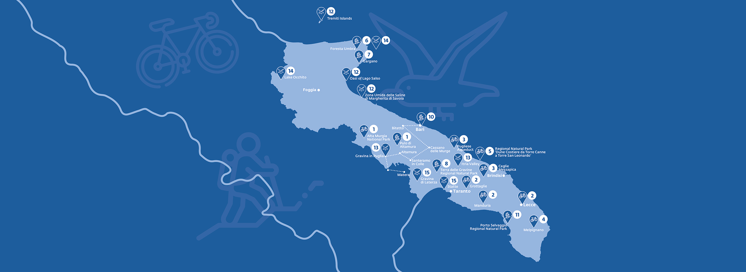 Fuel your pedalling with a taste of Puglia's best-known wines on a tour of the sun-baked hinterland between Grottaglie and Lecce. The route takes in historic towns and flamboyant baroque architecture as well as endless vineyards around Manduria, capital of Puglia's prized Primitivo wine. Further east, Primitivo gives way to Negroamaro, a grape used to produce dark, robust reds. This 97 km trail is one of 12 long-distance routes that traverse the region following old pilgrim routes, ancient paths and quiet country roads. For further information see.